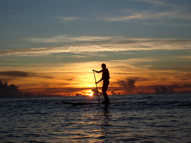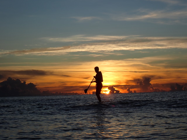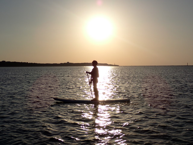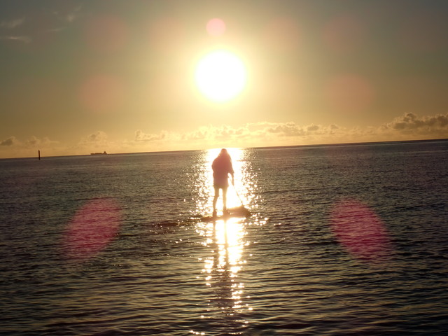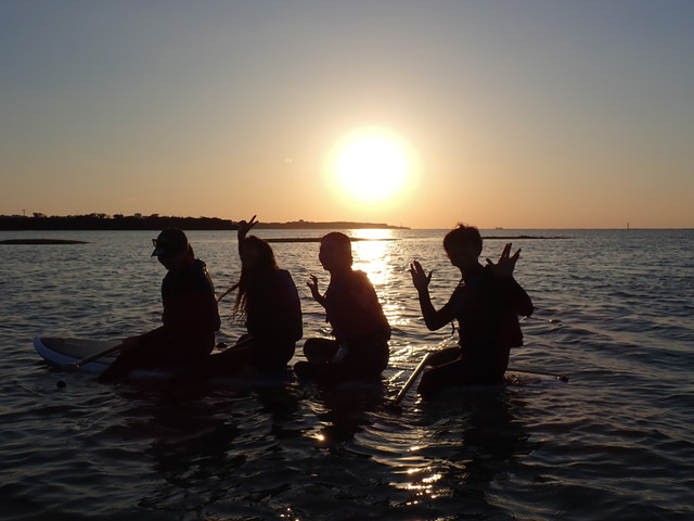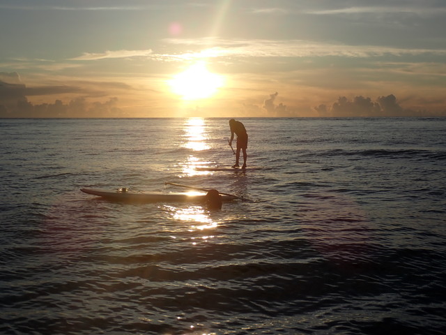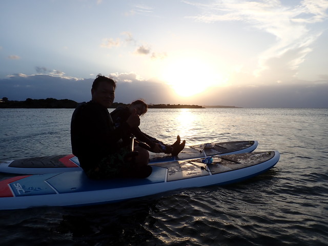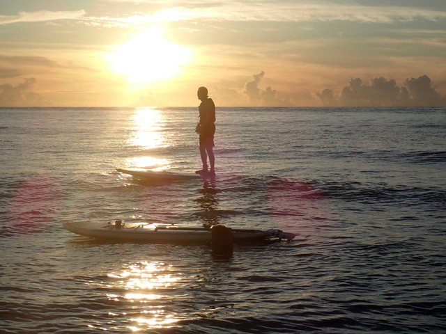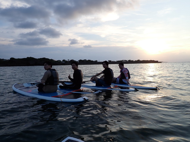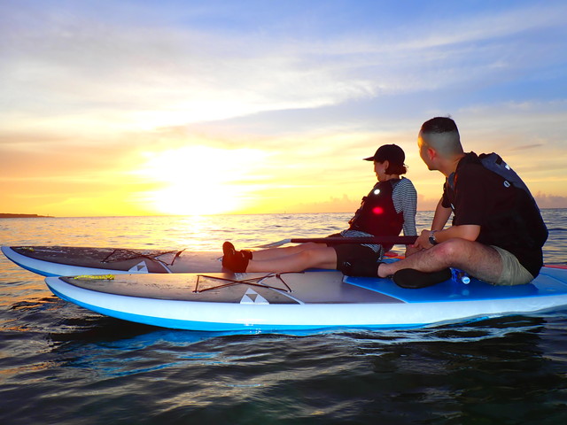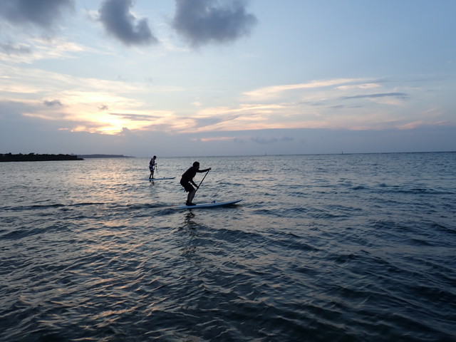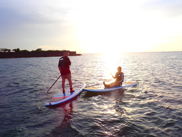 夕陽が美しく輝く沖縄の海で、穏やかな時間を楽しみながらサップをおこないます。