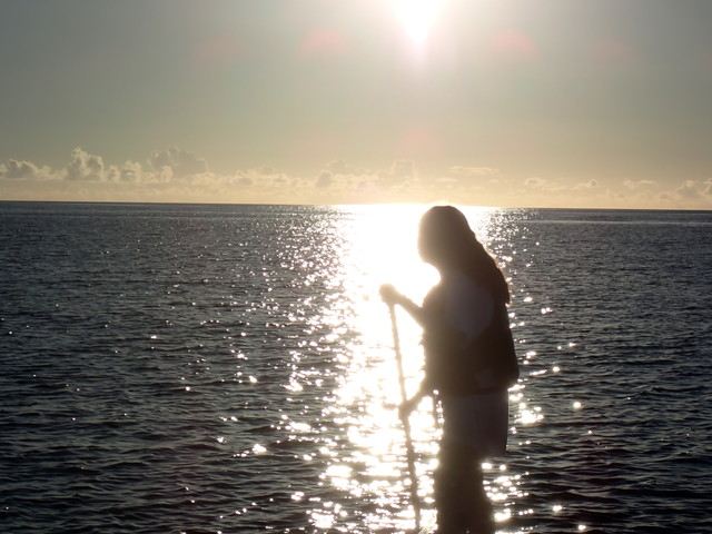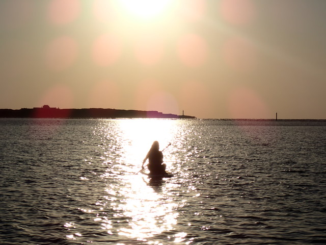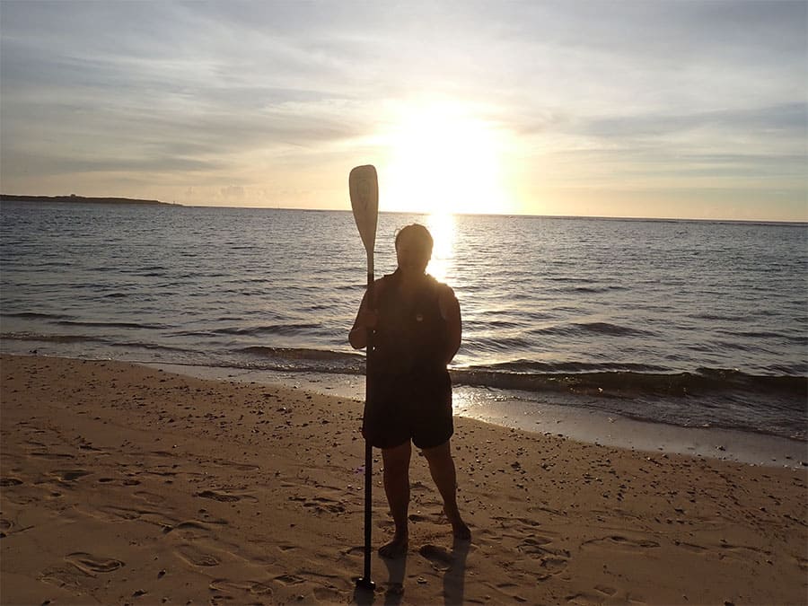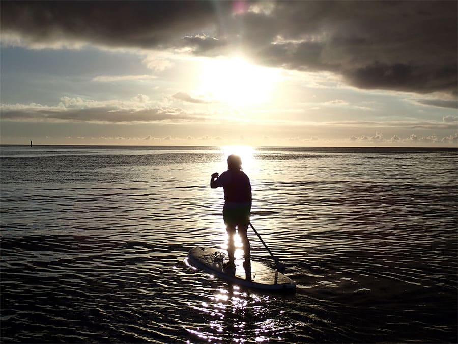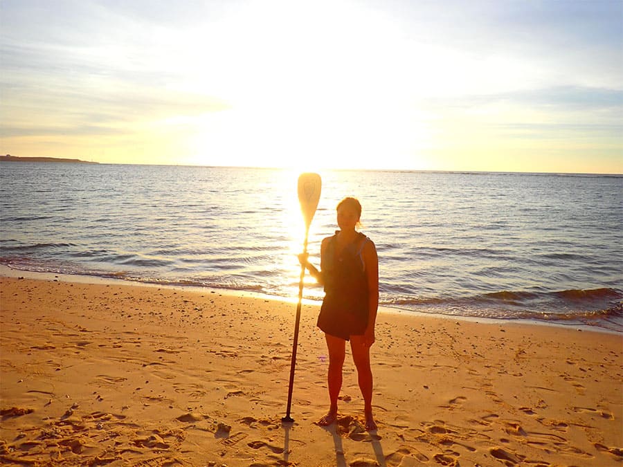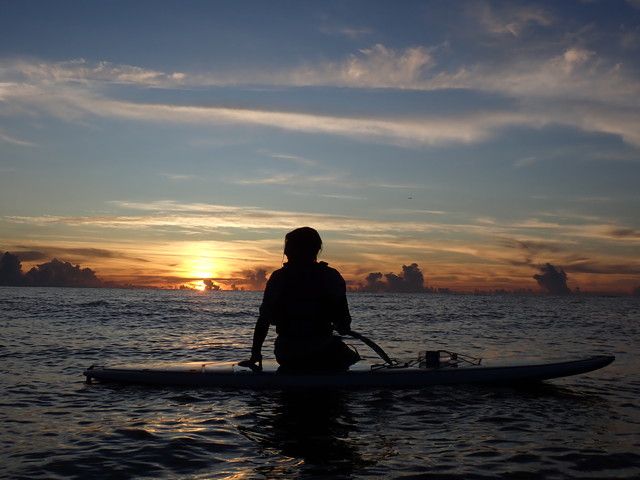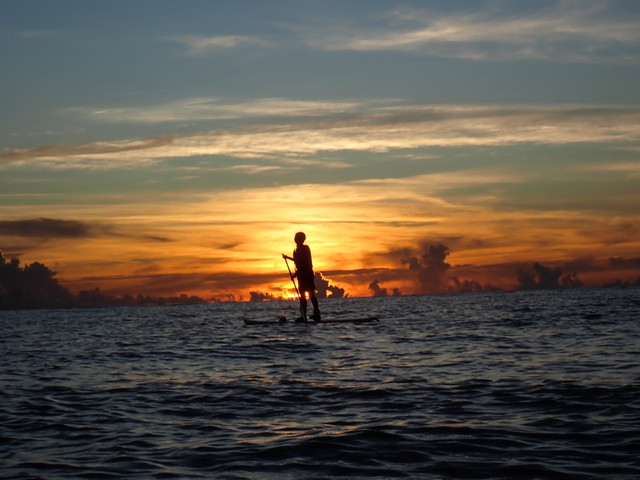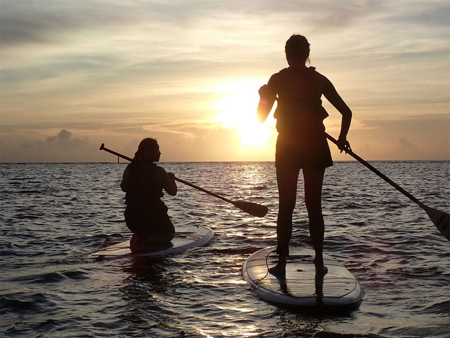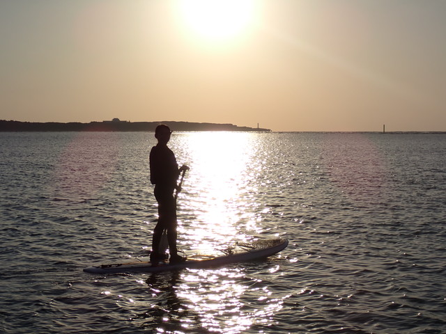 夕陽が美しく輝く沖縄の海で、穏やかな時間を楽しみながらサップをおこないます。